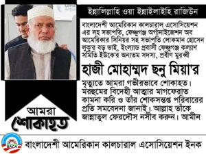 বাংলাদেশী আমেরিকান কালচারাল এসোসিয়েশন এর সকল সদস্যপদ ও কর্মকর্তাবৃন্দ সংগঠনের সহ সভাপতি লোকমান হোসেন লুকু’র ভাইয়ের মৃত্যুতে গভীরভাবে শোকাহত। বাকা পরিবারের পক্ষ থেকে সংগঠনের সভাপতি আহবাব চৌধুরী খোকন ও সাধারণ সম্পাদক সারওয়ার চৌধুরী গভীর শোক প্রকাশ করে শোকসন্তপ্ত পরিবারের সবার প্রতি সমবেদনা জানান। এদিকে অপর এক শোকবার্তায় বাকা’র প্রতিষ্ঠাতা সভাপতি ও বাংলাদেশ সোসাইটি’র ট্রাস্টি বোর্ড সদস্য আব্দুল হাসিম হাসনু অনুরূপ শোক ও সমবেদনা জানিয়েছেন।