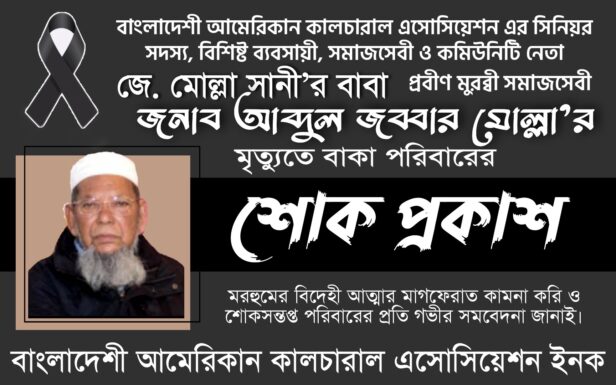 বাংলাদেশি আমেরিকান কালচারাল এসোসিয়েশন এর কার্যকরী কমিটির সিনিয়ার সদস্য, কুইন্স বাংলাদেশ সোসাইটির সাধারণ সম্পাদক, নরসিংদি জেলা সমিতি ইউএসএ ইনক এর প্রতিষ্ঠাতা সাধারণ সম্পাদক, বিশিষ্ট সমাজকর্মী ও ব্যবসায়ী জনাব জে. মোল্লা সানী’র পিতা প্রবীণ মুরব্বী ও সমাজসেবী জনাব আব্দুল জব্বার মোল্লা’র মৃত্যুতে বাংলাদেশী আমেরিকান কালচারাল এসোসিয়েশন বাকা পরিবারের পক্ষ থেকে গভীর শোক প্রকাশ এবং শোকসন্তপ্ত পরিবারের প্রতি সমবেদনা জানানো হয়েছে।