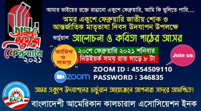 ২১শে ফেব্রুয়ারি মহান শহীদ দিবস ও আন্তর্জাতিক মাতৃভাষা দিবস উদযাপন উপলক্ষে বাংলাদেশী আমেরিকান কালচারাল এসোসিয়েশন এর ভার্চুয়াল কর্মসূচিঃ